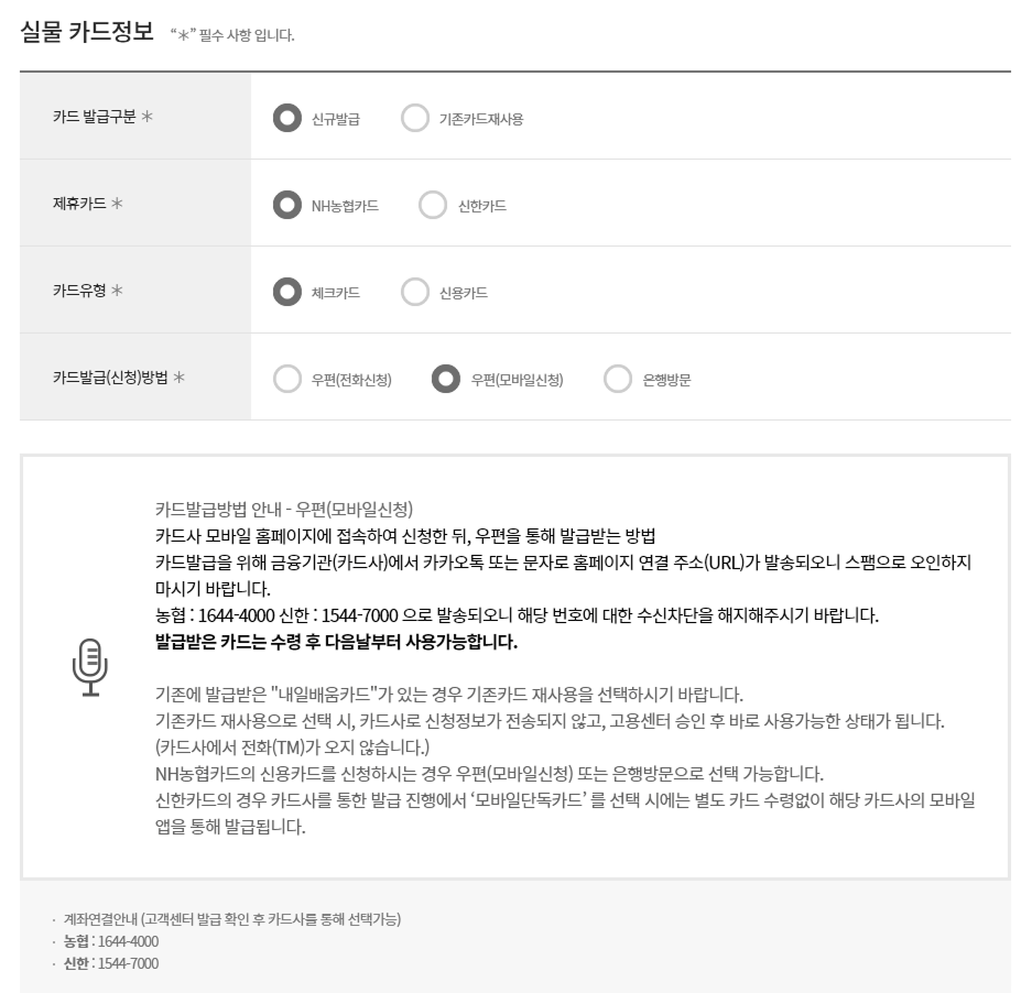 4. <½ÅûÀÎ Á¤º¸>¸¦ ¸ðµÎ ÀÔ·ÂÇÑ µÚ ³»ÀϹè¿òÄ«µå·Î ¹ß±Þ ¹Þ°íÀÚ ÇÏ´Â <½Ç¹° Ä«µåÁ¤º¸>¸¦ ¼±ÅÃÇØÁÖ¼¼¿ä.