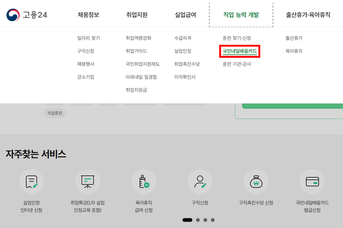 1. °í¿ë24¿¡¼ ȸ¿ø °¡ÀÔ ÈÄ <Á÷¾÷ ´É·Â °³¹ß> ÅÇ¿¡¼ <±¹¹Î³»ÀϹè¿òÄ«µå>¸¦ Ŭ¸¯ÇØÁÖ¼¼¿ä.